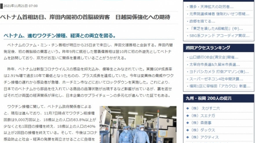 VOV.VN - Trang báo mạng Data-Max của Nhật Bản ngày 21/11 có bài viết “Thủ tướng Việt Nam thăm Nhật Bản, chính khách đầu tiên của Nội các Thủ tướng Kishida Fumio và kỳ vọng tăng cường quan hệ Nhật Bản - Việt Nam”.