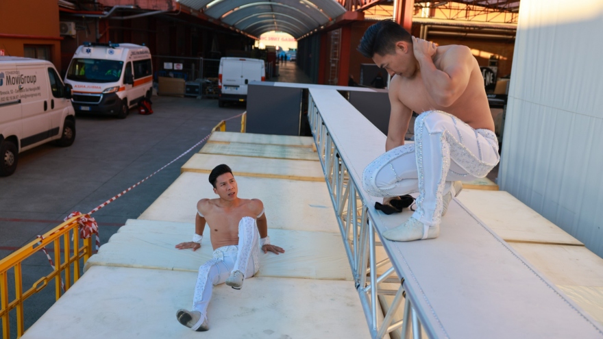 Chiều 2/2 (giờ Italy), nghệ sĩ xiếc Quốc Nghiệp bị ngã khi cùng anh trai Quốc Cơ tập với khung giàn do ban tổ chức cung cấp. Nhờ đệm an toàn, hai anh em không bị chấn thương.