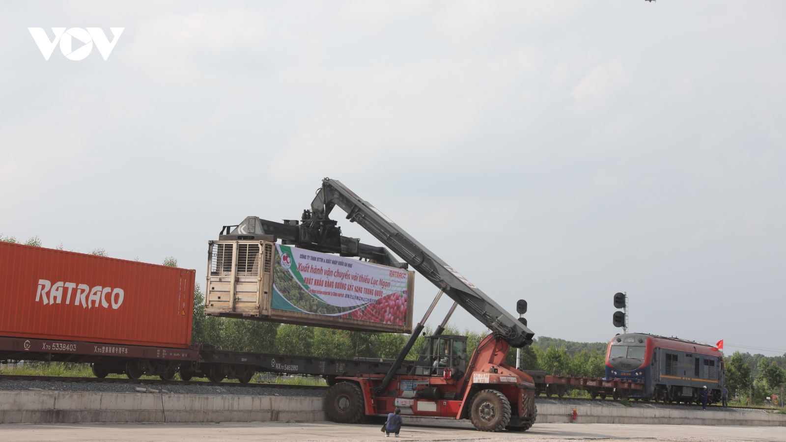 VOV.VN - Chuyến tàu đầu tiên chở 3 container chuyên dụng với 56 tấn vải thiều tươi Lục Ngạn đã chính thức xuất hành từ Ga liên vận quốc tế Kép, tỉnh Bắc Giang xuất khẩu chính ngạch sang Trung Quốc.
