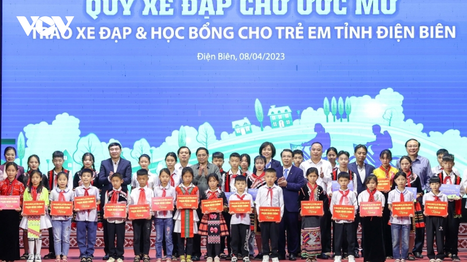 VOV.VN - Chiều 8/4, trong chương trình công tác tại tỉnh Điện Biên, Thủ tướng Phạm Minh Chính và đoàn công tác đã tặng quà, trao học bổng của các nhà tài trợ cho 300 trẻ em của làng trẻ SOS và trẻ em có hoàn cảnh đặc biệt khó khăn trên địa bàn thành phố Điện Biên Phủ và huyện Điện Biên.