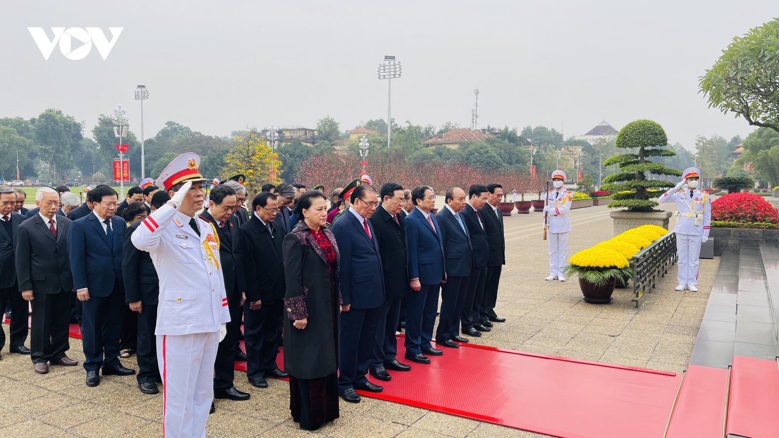 VOV.VN - Nhân dịp đón Xuân mới Quý Mão 2023, sáng 19/1, Đoàn đại biểu lãnh đạo, nguyên lãnh đạo Đảng, Nhà nước và Ủy ban Trung ương Mặt trận Tổ quốc Việt Nam đã tới đặt vòng hoa, vào Lăng viếng Chủ tịch Hồ Chí Minh và dâng hương tưởng niệm các Anh hùng liệt sĩ tại Đài tưởng niệm ở đường Bắc Sơn, Hà Nội.