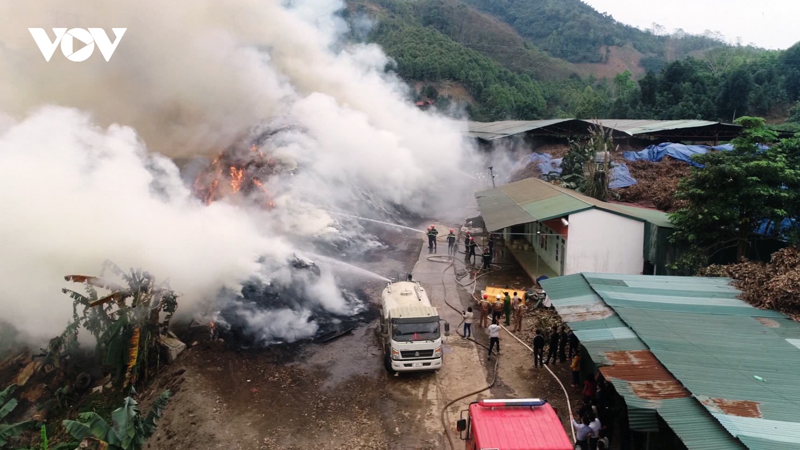 VOV.VN - Thiệt hại ban đầu ghi nhận được gồm 1 khung nhà thép lợp tôn với diện tích 200m2 để chế biến lá, cành quế thải trước khi ép thành bánh than đốt và 500m3 cành, lá quế thải đang chờ xử lý.
