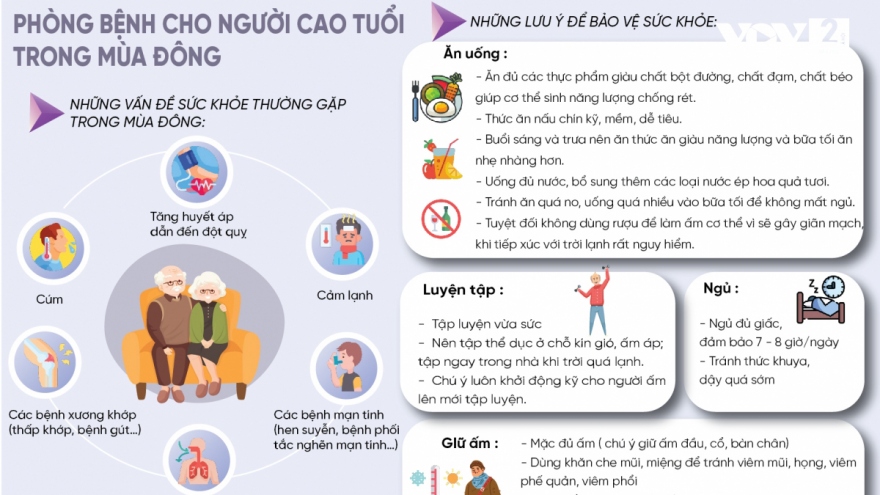 VOV.VN - Thời tiết mùa đông khắc nghiệt, giá lạnh, hệ miễn dịch của người cao tuổi đã lão hóa, suy yếu, sức đề kháng kém, rất dễ mắc bệnh. Để đảm bảo sức khỏe trong mùa đông, người cao tuổi cần chú ý một số biện pháp nâng cao sức khỏe.