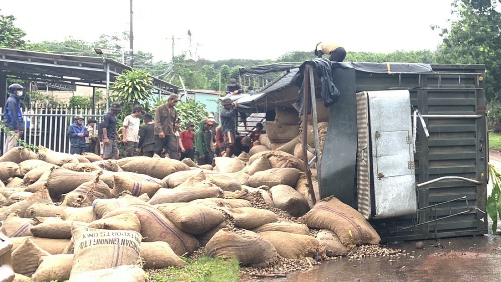 VOV.VN - Sáng 22/4, trên quốc lộ 14, đoạn qua thôn 8, xã Đức Liễu, huyện Bù Đăng, tỉnh Bình Phước, một chiếc xe đầu kéo bị lật trước cầu khiến hàng chục tấn hạt điều bị văng ra đường làm kẹt xe nhiều giờ liền.