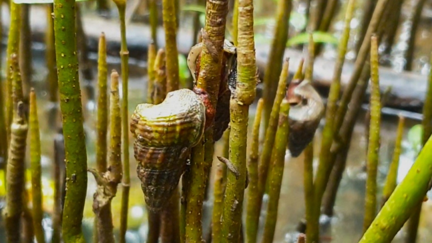 VOV.VN - Ốc len sinh sống dưới tán rừng ngập mặn ven biển tỉnh Cà Mau. Nhiều người dân địa phương làm nghề bắt ốc len để kiếm thêm thu nhập, cũng có người nuôi ốc len để phát triển kinh tế.