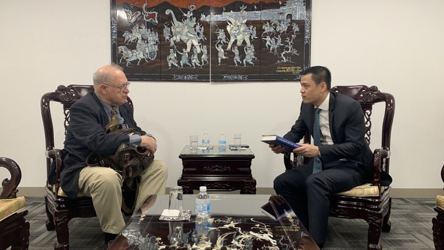 VOV.VN - Đại sứ Đặng Hoàng Giang, Trưởng Phái đoàn Thường trực Việt Nam tại LHQ ngày 1/4 đã tiếp ông John McAuliff, một người bạn lâu năm, thân thiết của Việt Nam tại New York.