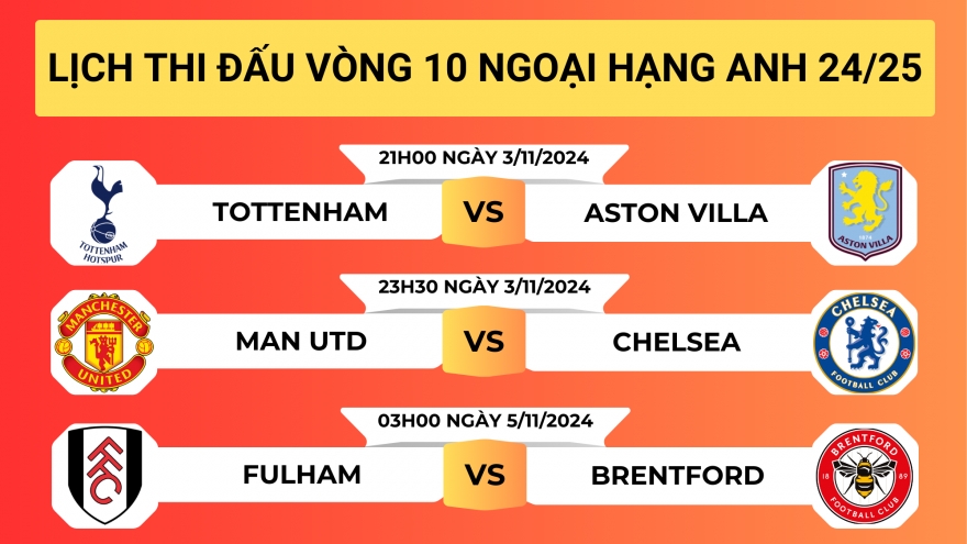 VOV.VN - Lịch thi đấu vòng 10 Ngoại hạng Anh 2024/2025, MU có cuộc tiếp đón Chelsea trên sân nhà Old Trafford, trong khi Arsenal có chuyến hành quân đến St. James' Park của Newcastle.