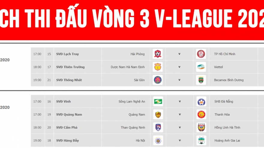 Lịch thi đấu vòng 3 V-League 2020: Hàng Đẫy và Lạch Tray mở hộiVOV.VN - Lịch thi đấu vòng 3 V-League 2020, hai trận đấu đáng chú ý là cuộc đọ sức giữa Hà Nội FC vs HAGL và Hải Phòng vs TPHCM.