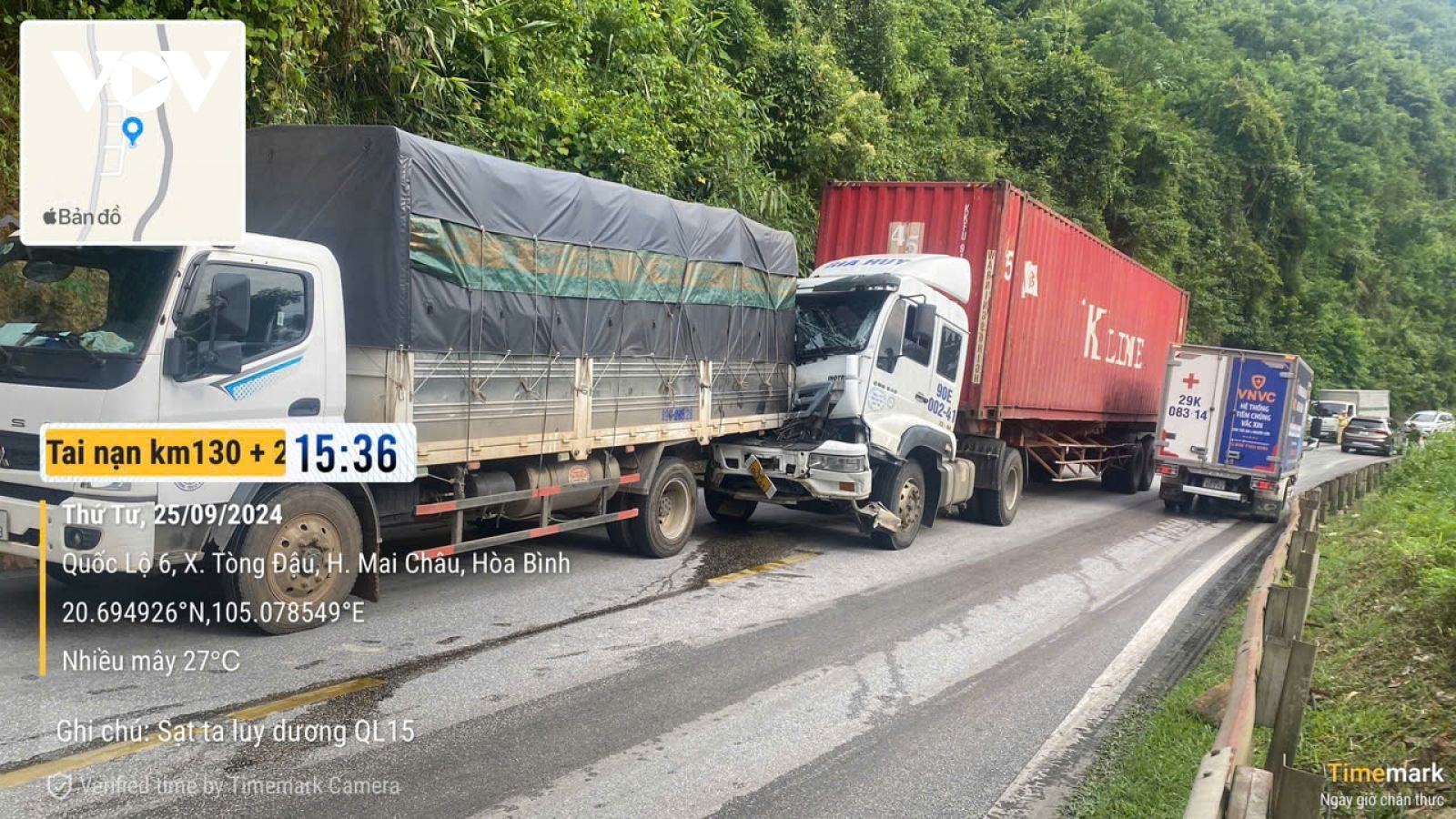VOV.VN - Chiều 25/9, tại Km130+200 trên Quốc lộ 6 thuộc địa phận xã Tòng Đậu huyện Mai Châu, tỉnh Hòa Bình xảy ra vụ tai nạn giao thông liên hoàn khiến 2 người bị thương, giao thông ùn ứ.