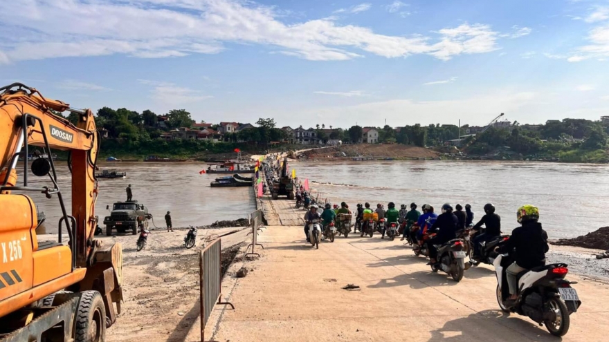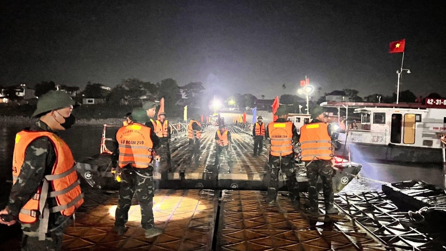 VOV.VN - Cán bộ, chiến sĩ Lữ đoàn 249 (Binh chủng Công binh) đã thức xuyên đêm 6/7 để lắp nối lại cầu phao Phong Châu sau 5 ngày gián đoạn, phục vụ người dân di chuyển qua đây từ 6h sáng nay 7/7.