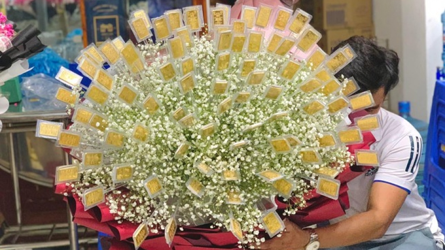 Bó hoa được đính 100 lượng vàng (trị giá khoảng 7 tỷ đồng), được một đại gia ở TP Cần Thơ dành tặng vợ nhân ngày Quốc tế Phụ nữ 8/3 đã thu hút sự quan tâm của dư luận.