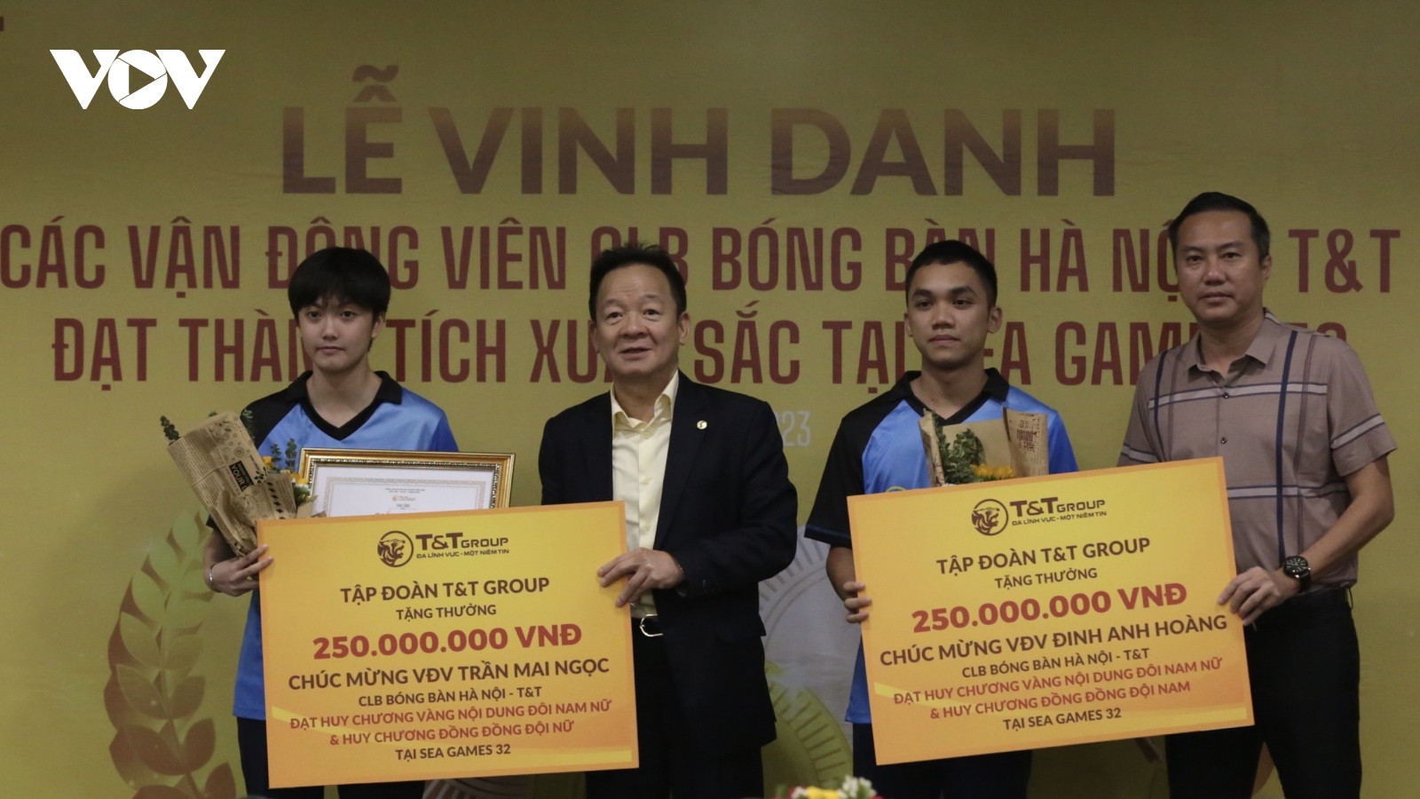 VOV.VN - Ông bầu Đỗ Quang Hiển thưởng hơn 1 tỷ đồng cho bộ đôi Trần Mai Ngọc/Đinh Anh Hoàng và các HLV bóng bàn đã mang về tấm HCV lịch sử ở nội dung đôi nam nữ tại SEA Games 32.