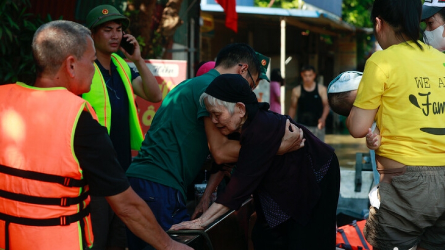 Bí thư và Trưởng thôn Xuân Sơn (xã Trung Giã, Hà Nội) phát hiện hai cụ già mắc kẹt trên mái nhà, do chưa có thuyền cứu hộ, các ông phải bơi vào đưa hai cụ ra ngoài.