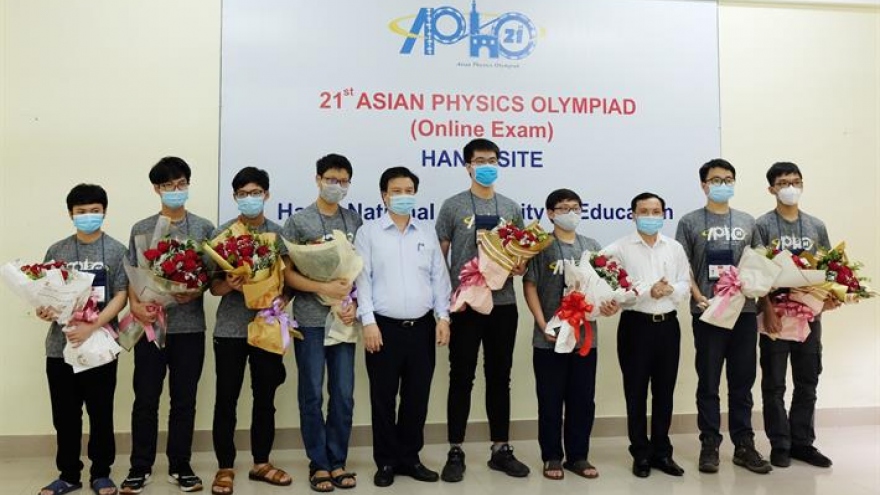 VOV.VN - Ngày 24/5, tại Đại học Sư phạm Hà Nội, đội tuyển Việt Nam dự thi Olympic Vật lí Châu Á - Thái Bình Dương (APhO) năm 2021 đã dự trực tuyến lễ bế mạc kỳ thi.