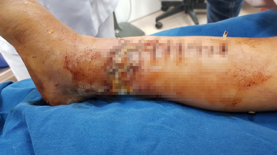 VOV.VN - Khi ngồi chơi trên nền nhà đang xây sửa, bé trai 7 tuổi, ở Thanh Hóa bị máy xúc múc phải khiến cẳng chân bên phải dập nát nghiêm trọng, nguy cơ phải phẫu thuật cắt cụt.