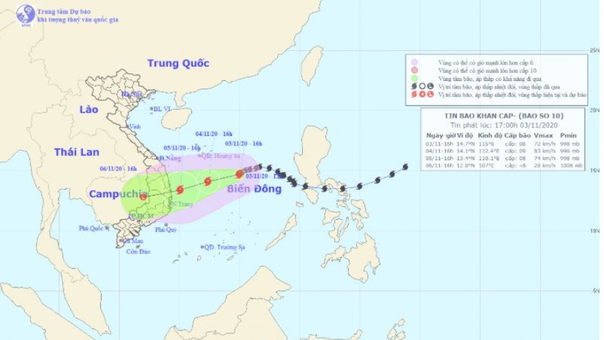 VOV.VN - Từ đêm nay (3/11), vùng biển từ Quảng Nam đến Ninh Thuận gió mạnh dần lên cấp 6, từ chiều mai (4/11) tăng lên cấp 7, vùng gần tâm bão cấp 8, giật cấp 10, sóng biển cao từ 3-5m, biển động mạnh.