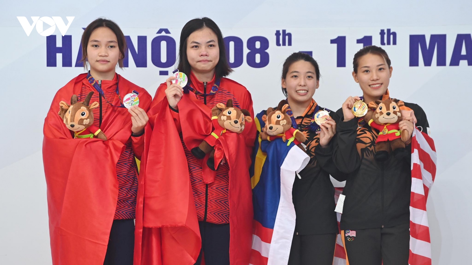 VOV.VN - Tại nội dung đôi nữ cầu mềm 3m diễn ra chiều 9/5, đôi nữ Phương Mai - Hồng Hạnh đã xuất sắc giành huy chương bạc với tổng số 237.57 điểm.