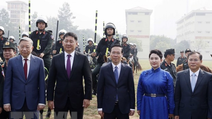 VOV.VN - Tổng thống Mông Cổ, Chủ tịch nước Võ Văn Thưởng và các đại biểu đã chứng kiến phần trình diễn kỹ, chiến thuật chiến đấu của lực lượng Cảnh sát Đặc nhiệm, Cảnh sát Cơ động và đặc biệt là phần trình diễn của Lực lượng Cảnh sát Cơ động kỵ binh.