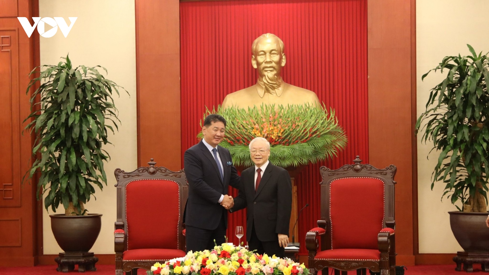 VOV.VN - Chiều 1/11, tại Trụ sở Trung ương Đảng, Tổng Bí thư Nguyễn Phú Trọng đã tiếp Tổng thống Mông Cổ Ukhnaagiin Khurelsukh đang tiến hành chuyến thăm cấp Nhà nước tới Việt Nam.