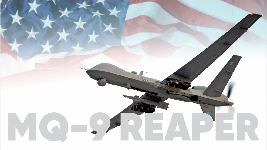 VOV.VN - Máy bay không người lái MQ-9 Reaper có thể bay ở độ cao 15.000m trong hơn 27 giờ, thu thập thông tin tình báo bằng camera, cảm biến và radar tinh vi. Reaper cũng có thể được trang bị vũ khí như tên lửa không đối đất, bom có điều khiển, tên lửa không đối không.
