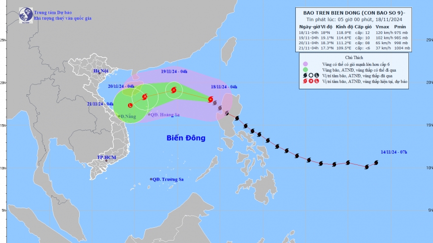 VOV.VN - Theo Trung tâm Dự báo Khí tượng thủy văn quốc gia, hồi 4 giờ sáng nay 18/11, vị trí tâm bão ở vào khoảng 18,0 độ Vĩ Bắc; 118,9 độ Kinh Đông, trên vùng biển phía Đông của khu vực Bắc Biển Đông. Sức gió mạnh nhất vùng gần tâm bão mạnh cấp 11-12 (103-133km/h), giật cấp 15. Di chuyển theo hướng Tây Bắc, tốc độ khoảng 25km/h.