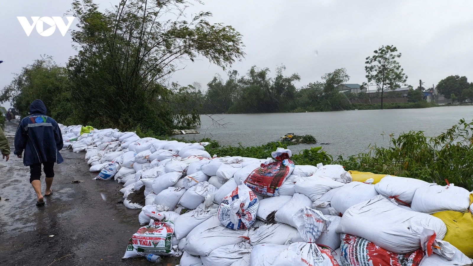 VOV.VN - Bắt đầu từ chiều hôm qua (10/9), do ảnh hưởng của mưa lớn kéo dài nên một số đoạn đê thuộc thôn Đại Áng, xã Đại Áng, huyện Thanh Trì (Hà Nội) nước dâng cao, có nguy cơ bị tràn, gây ảnh hưởng nghiêm trọng đến đời sống nhân dân. Để kịp thời ứng phó với thiên tai, các lực lượng cơ động và dân quân đã tích cực phối hợp với nhân dân địa phương dầm mưa đắp đê ngăn lũ.