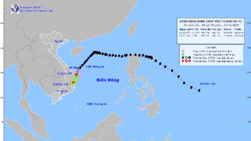 VOV.VN - Thời tiết ngày 12/11, khu vực từ Thừa Thiên Huế đến Phú Yên có mưa vừa, mưa to, cục bộ có nơi mưa rất to và dông với lượng mưa từ 70-150mm, cục bộ có nơi trên 250mm.