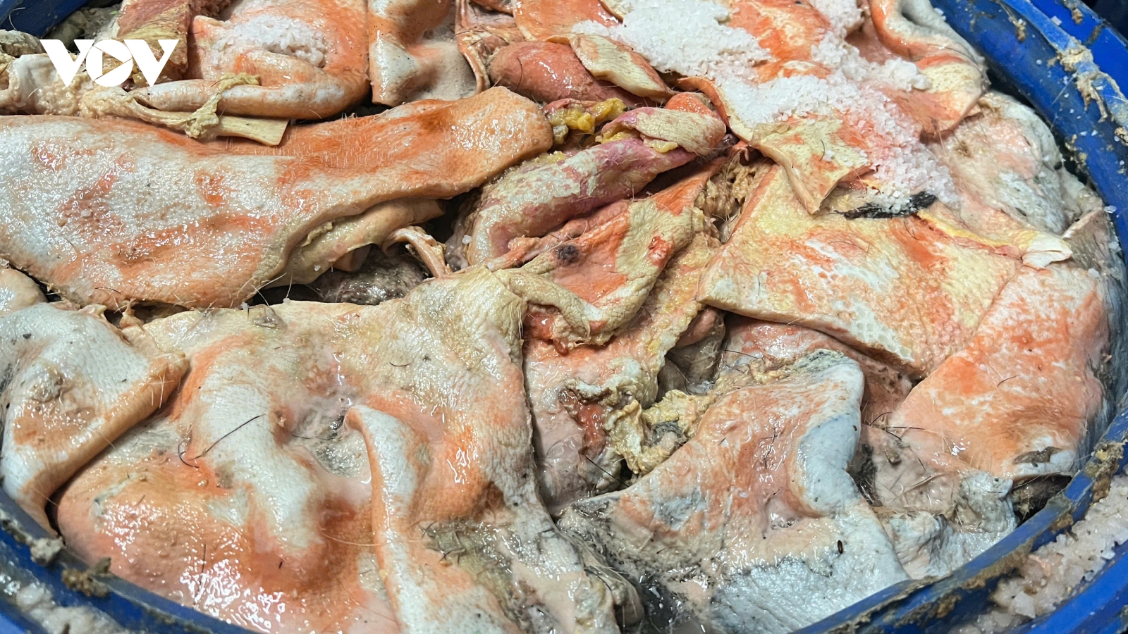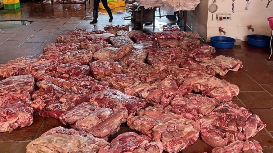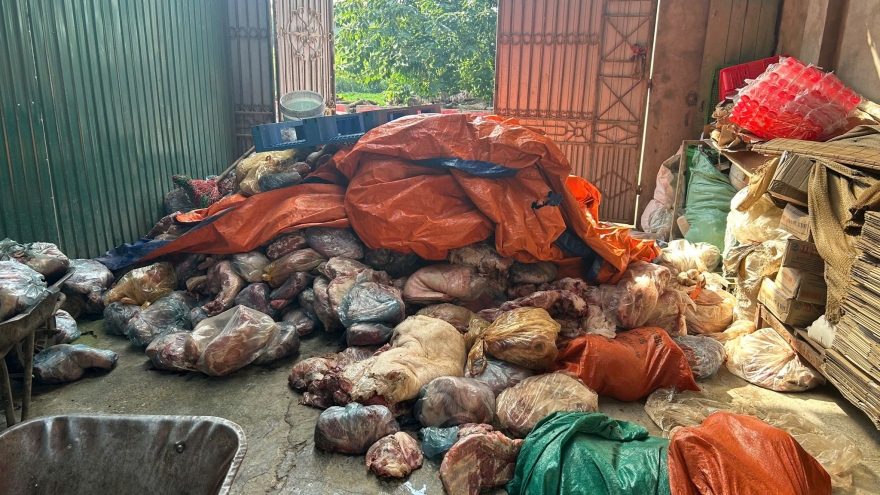 VOV.VN - Công an xã Liên Châu, tỉnh Phú Thọ (huyện Yên Lạc, Vĩnh Phúc cũ) thu giữ hàng tấn thịt lợn bốc mùi chuẩn bị chế biến thành lạp xưởng, thịt sấy khô và thịt hun khói để tiêu thụ.
