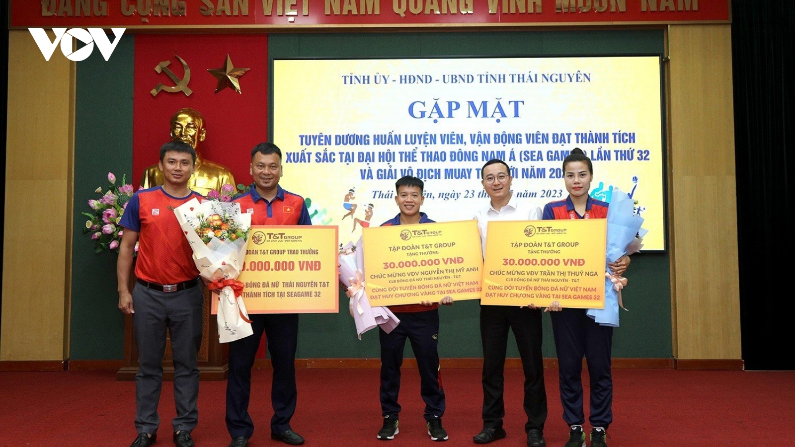 VOV.VN - Hai cầu thủ Mỹ Anh và Thúy Nga của CLB bóng đá nữ Thái Nguyên đã được Tập đoàn T&T Group trao thưởng sau thành tích giành tấm HCV lịch sử môn bóng đá nữ tại SEA Games 32.