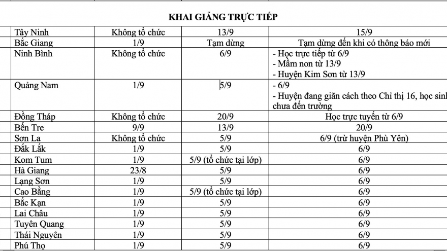 VOV.VN - Sáng nay (5/9), nhiều tỉnh, thành phố đồng loạt tổ chức lễ khai giảng năm học mới theo nhiều hình thức khác nhau từ trực tiếp, đến trực tuyến, khai giảng qua truyền hình... nhằm phù hợp với tình hình dịch bệnh Covid-19.