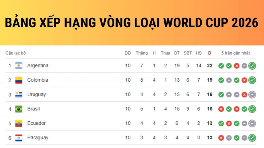VOV.VN - Cập nhật bảng xếp hạng vòng loại World Cup 2026 khu vực Nam Mỹ trước lượt trận 11, Brazil đang tăng tốc và thu hẹp khoảng cách với đội dẫn đầu Argentina xuống còn 6 điểm.