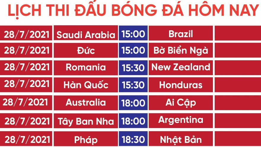 VOV.VN - Theo lịch thi đấu bóng đá Olympic Tokyo 2020 hôm nay 25/7, Brazil so tài với đối thủ yếu hơn là Bờ Biển Ngà, trong khi Nhật Bản đối đầu với Mexico.