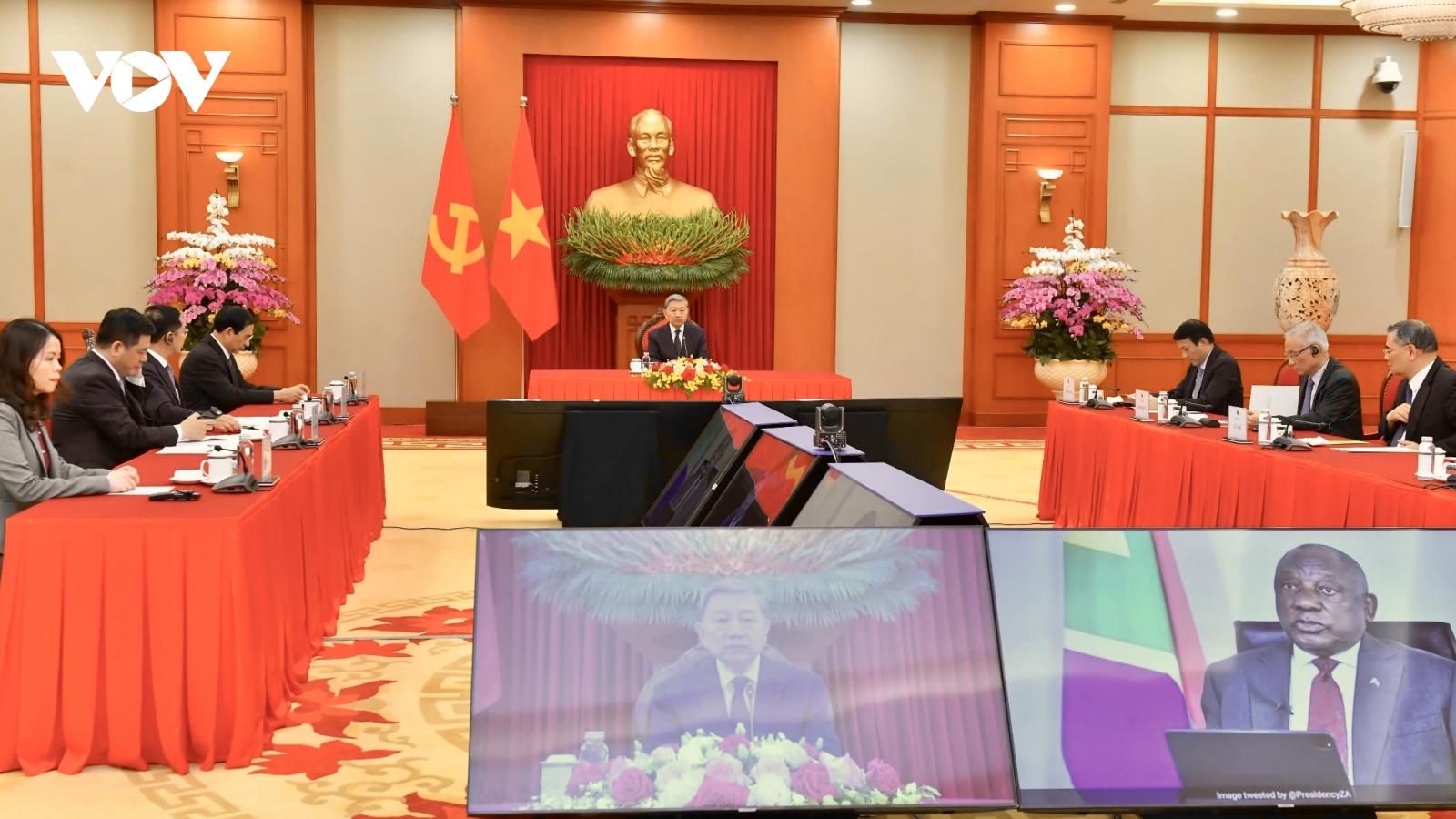 VOV.VN - Chiều 22/4, tại Trụ sở Trung ương Đảng, Tổng Bí thư Tô Lâm đã có cuộc điện đàm với Chủ tịch Đảng Đại hội Dân tộc Phi (ANC), Tổng thống nước Cộng hòa Nam Phi Cyril Ramaphosa.