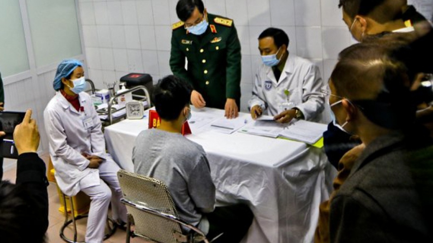VOV.VN - Sáng 17/12, tại Học viện Quân y (Hà Nội), ba tình nguyện viên đầu tiên, gồm hai nam và một nữ, đã được tiêm thử mũi 1 vaccine COVID-19 của Nanocovax.