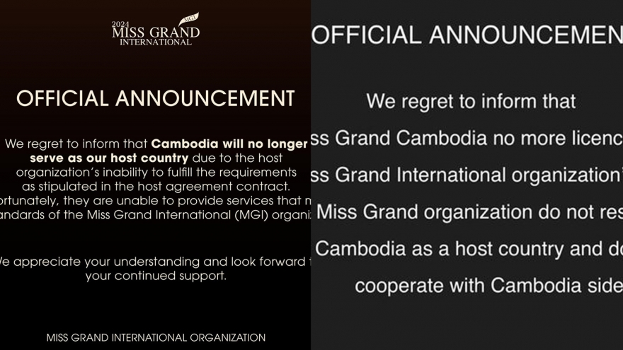 VOV.VN - Tối 6/10, trang chủ Miss Grand International (MGI) đăng tải thông báo tước quyền đăng cai của Campuchia, dù cuộc thi đã diễn ra được vài ngày. Phía Miss Grand Campuchia cũng nhanh chóng thông báo chấm dứt hợp tác với MGI.