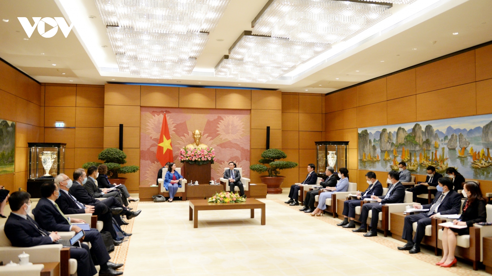 VOV.VN - Chiều tối 22/3, tại Nhà Quốc hội, Chủ tịch Quốc hội Vương Đình Huệ tiếp bà Manuela Ferro, Phó Chủ tịch Ngân hàng Thế giới (WB) phụ trách khu vực Đông Á-Thái Bình Dương nhân dịp có chuyến công tác tại Việt Nam từ ngày 17/3- 24/3.