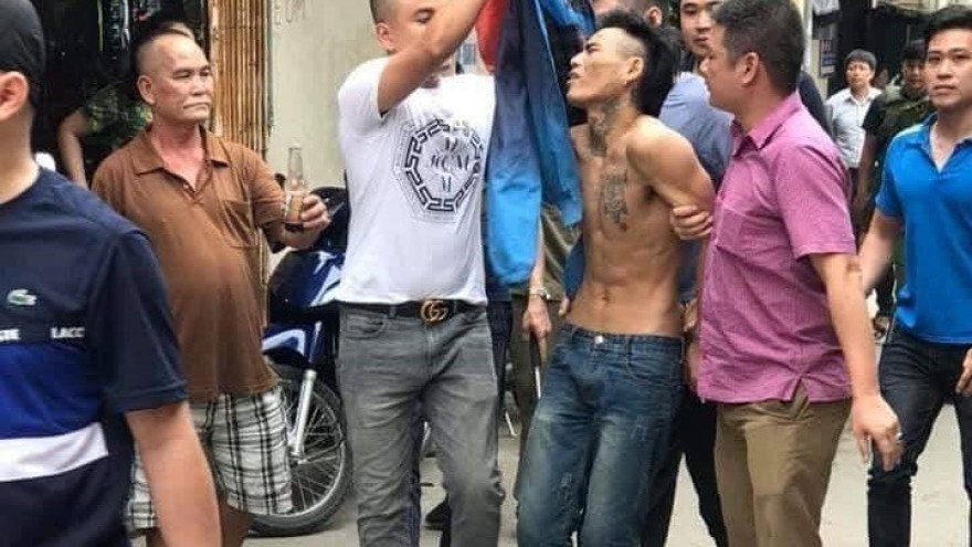 Nam thanh niên cởi trần, mặc quần đùi, đội mũ bảo hiểm chạy ra giữa đường cầm gậy, gạch đá, đứng múa máy, đồng thời chặn nhiều xe ôtô lưu thông qua đây.