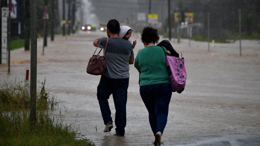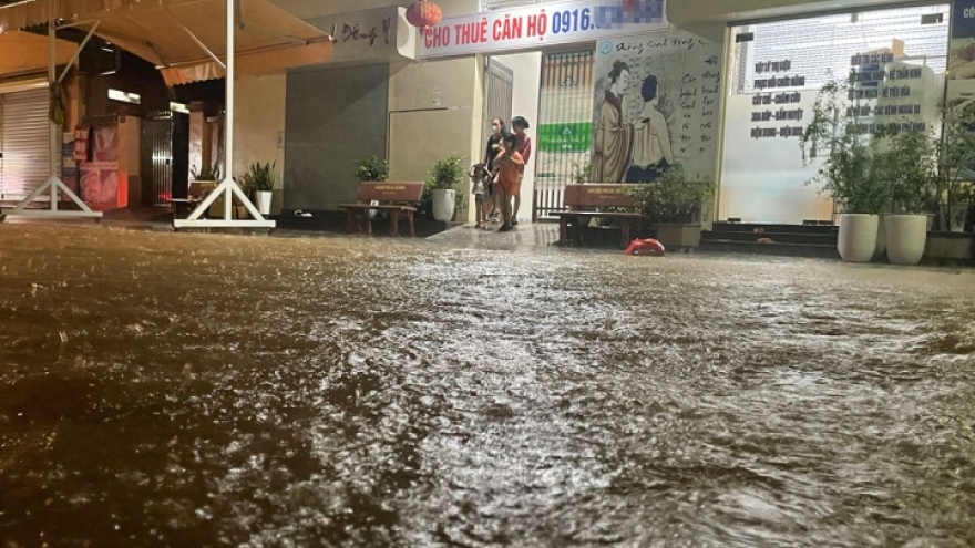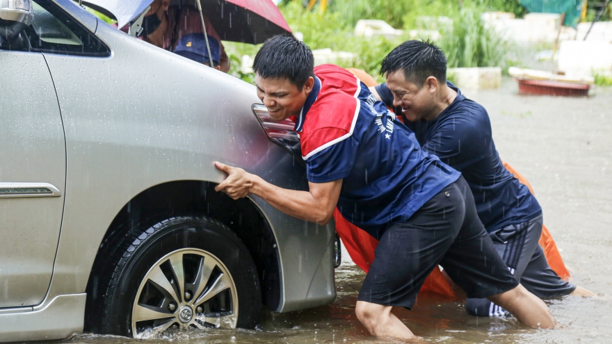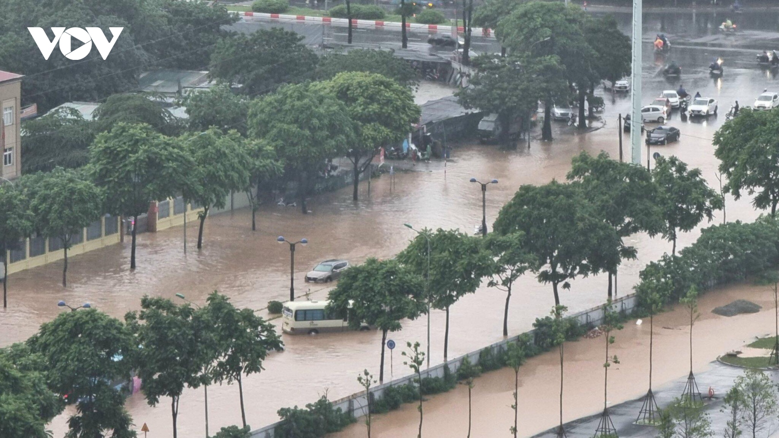 VOV.VN - Cơn mưa lớn kéo dài nhiều giờ đã khiến rất nhiều đường phố ở Hà Nội chìm trong biển nước, người và phương tiện lóp ngóp di chuyển trong dòng nước ngập sâu.