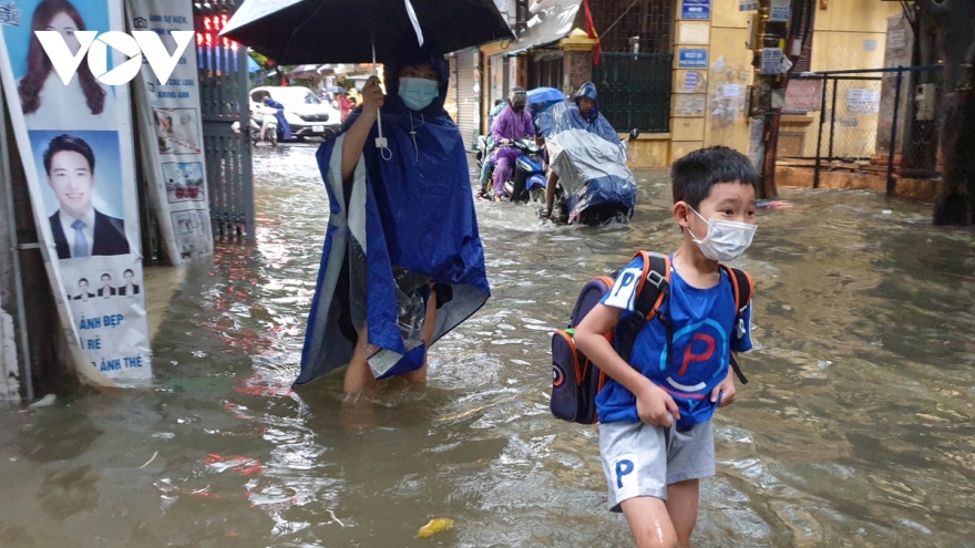 VOV.VN - Ảnh hưởng của hoàn lưu bão số 2 gây mưa lớn kéo dài từ đêm đến sáng 12/8 khiến nhiều tuyến đường Hà Nội ngập sâu. Nhiều nơi học sinh phải lội nước đi học, người tham gia giao thông di chuyển khó khăn trên những còn đường ngập nước.