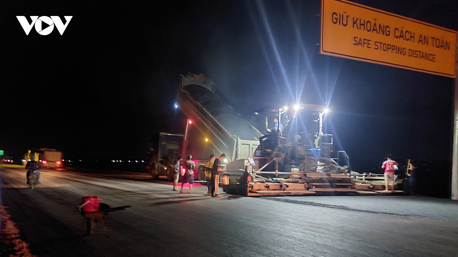 VOV.VN - Nhà thầu cao tốc Bắc-Nam đoạn Nghi Sơn - Diễn Châu đang huy động "3 ca, 4 kíp" hoàn thành các công đoạn cuối, tập trung thảm bê tông nhựa nóng mặt đường, sẵn sàng thông xe trước ngày 2/9.