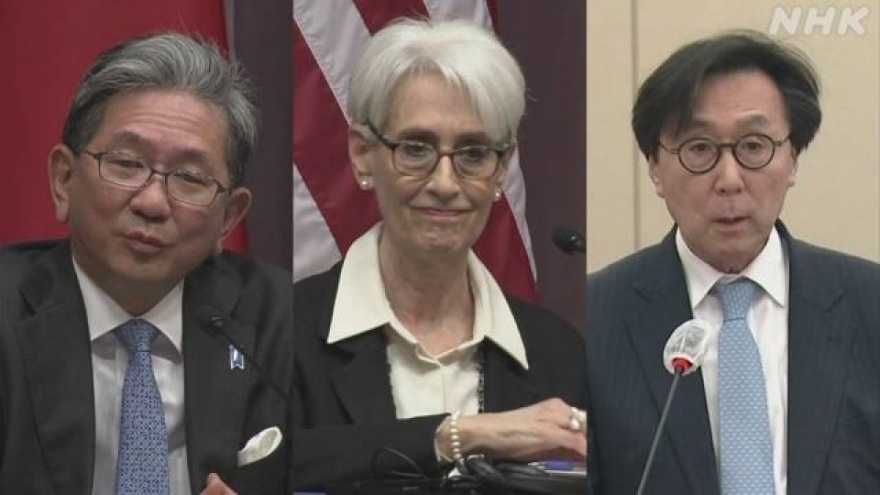 VOV.VN - Thứ trưởng Ngoại giao Mỹ Wendy Sherman ngày 24/7 đã có cuộc điện đàm với Thứ trưởng Ngoại giao Nhật Bản Mori Takeo và Thứ trưởng Ngoại giao Hàn Quốc Chang Ho-jin. Các bên đã thảo luận nỗ lực mở rộng đối tác ba bên và củng cố hợp tác khu vực và toàn cầu.