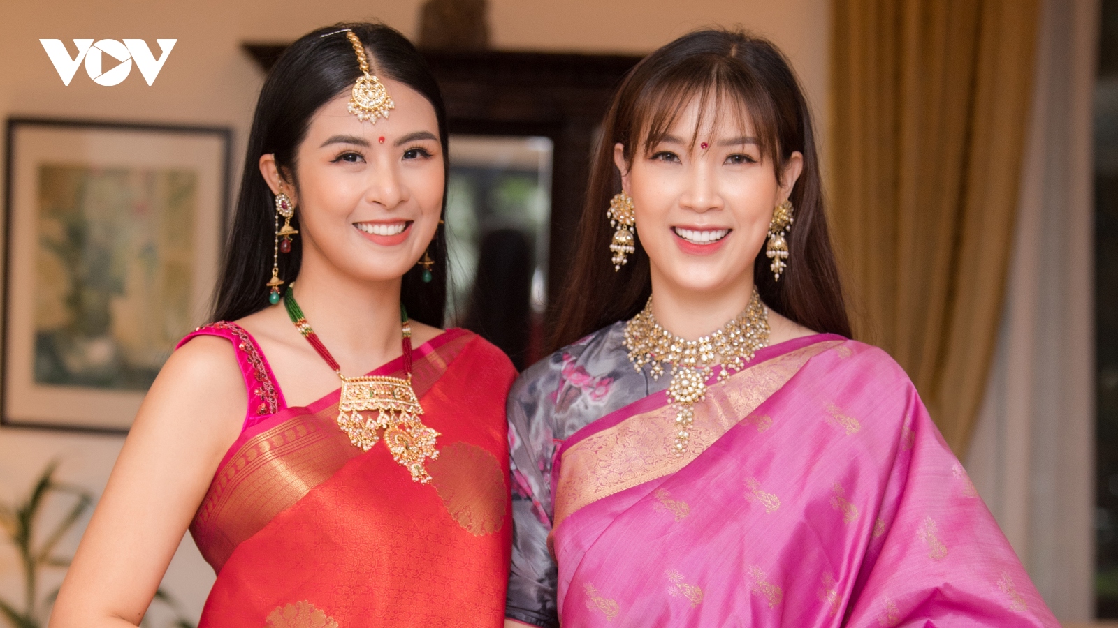 Hoa hậu Ngọc Hân và bạn thân Phí Thuỳ Linh lần đầu mặc trang phục truyền thống Ấn Độ
