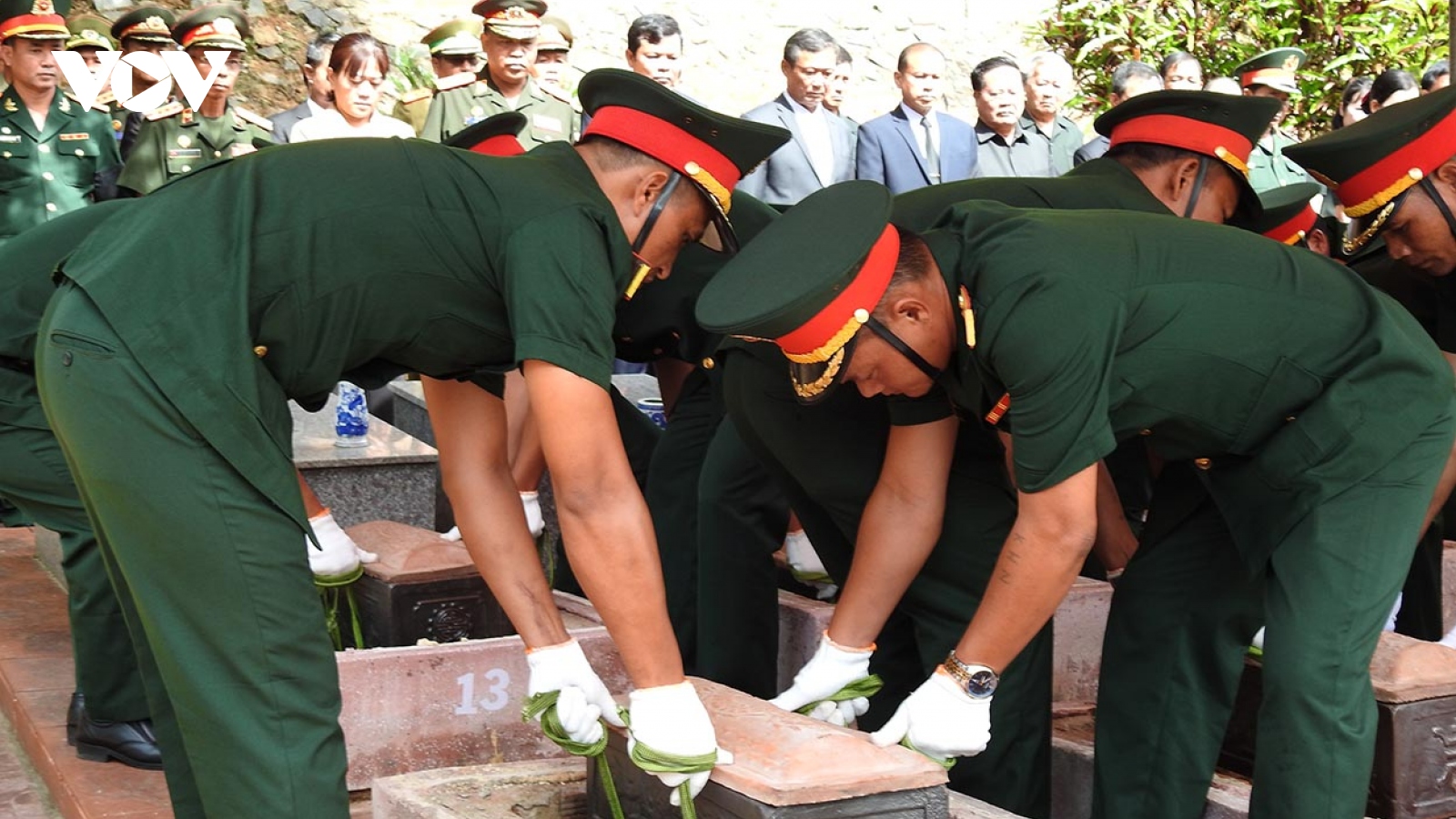 VOV.VN - Sáng nay (6/6), tại nghĩa trang liệt sỹ huyện biên giới Ngọc Hồi, Tỉnh ủy, HĐND, UBND, UBMTTQ Việt Nam tỉnh Kon Tum đã tổ chức Lễ truy điệu và an táng 16 hài cốt liệt sỹ quân tình nguyện, chuyên gia Việt Nam hy sinh qua các thời kỳ tại Lào và Campuchia do Đội K53 tỉnh Kon Tum quy tập được trong mùa khô vừa qua.