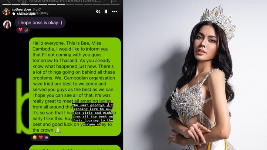 VOV.VN - Trưa 7/10, Miss Grand Campuchia Sotheary Bee đăng tải story trên Instagram, thông báo về việc mình sẽ không tiếp tục dự thi Miss Grand International 2024 và không cùng các thí sinh khác đến Thái Lan.