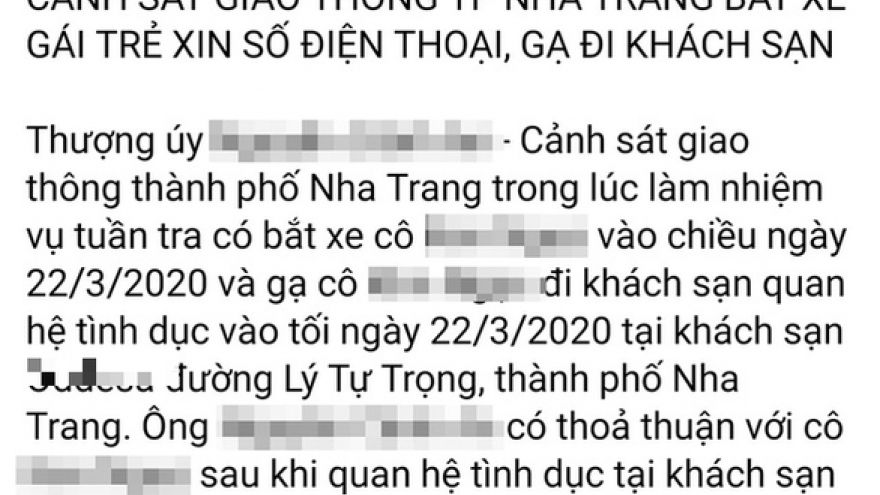 VOV.VN - Công an Khánh Hòa đang xác minh bài trên Facebook tố: “Cảnh sát giao thông thành phố Nha Trang bắt xe gái trẻ xin số điện thoại, gạ đi khách sạn".