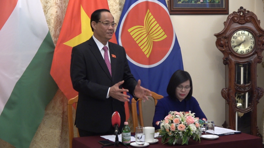 VOV.VN - Tối ngày 1/4 (theo giờ địa phương) tại thủ đô Budapest, Hungary, Phó Chủ tịch Quốc hội, Thượng tướng Trần Quang Phương dẫn đầu Đoàn công tác đã đến thăm, gặp gỡ cán bộ, nhân viên Đại sứ quán Việt Nam và đại diện Cộng đồng người Việt Nam tại Hungary.