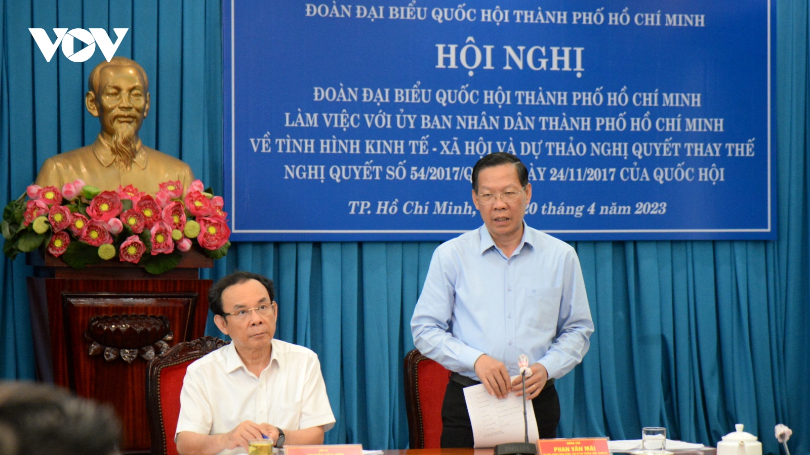 VOV.VN - Chiều 20/4, Đoàn Đại biểu Quốc hội (ĐBQH) TP.HCM làm việc với UBND TP về tình hình kinh tế-xã hội và dự thảo Nghị quyết thay thế Nghị quyết 54 của Quốc hội. Tham dự có Ủy viên Bộ Chính trị, Bí thư Thành ủy Nguyễn Văn Nên.