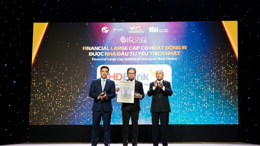 VOV.VN - Ngày 24/9, Ngân hàng TMCP Phát triển Thành phố Hồ Chí Minh (HDBank, mã chứng khoán: HDB) được bình chọn là "Doanh nghiệp niêm yết lĩnh vực tài chính vốn hóa lớn có hoạt động Quan hệ Nhà đầu tư được Nhà đầu tư yêu thích nhất", theo kết quả công bố tại IR Awards 2024 do Vietstock, Hiệp hội Các nhà Quản trị Tài chính Việt Nam (VAFE) và Tạp chí Fili đồng tổ chức.