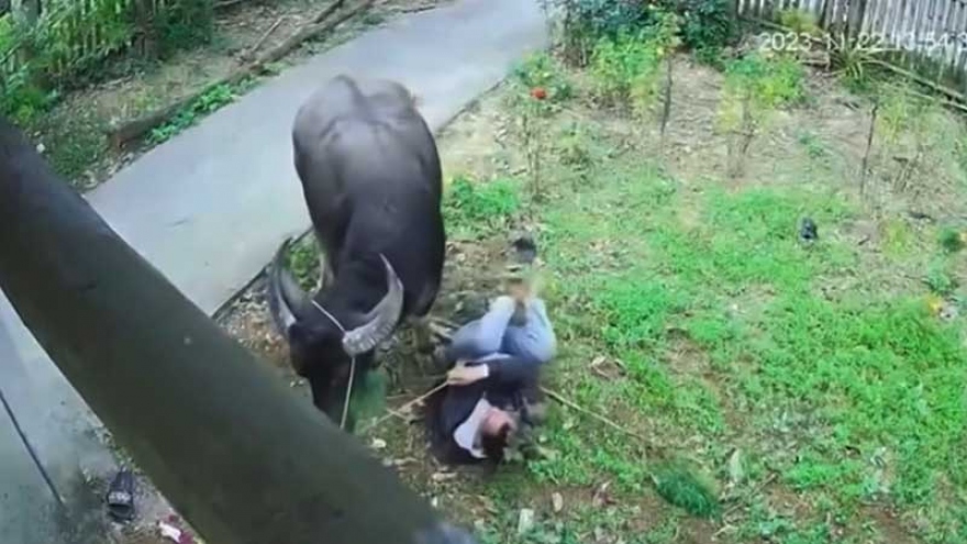 VOV.VN - Một con trâu lao vào nhà dân, húc văng chủ nhà cùng những người xung quanh. Sự việc xảy ra tại thành phố Bắc Kạn, tỉnh Bắc Kạn và được camera an ninh ghi lại.