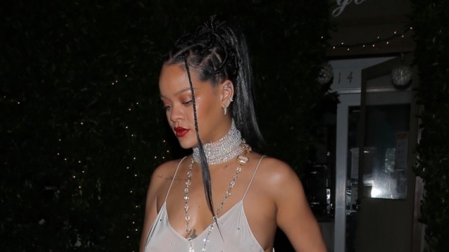 VOV.VN - Nữ ca sĩ Rihanna gây ấn tượng với lối trang điểm tinh tế, đeo trang sức đắt giá và diện đầm hai dây gợi cảm đến nhà hàng lúc nửa đêm cùng người thân.